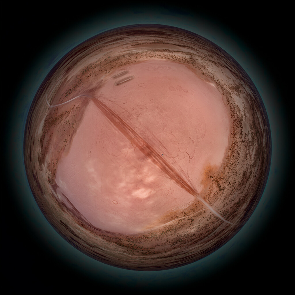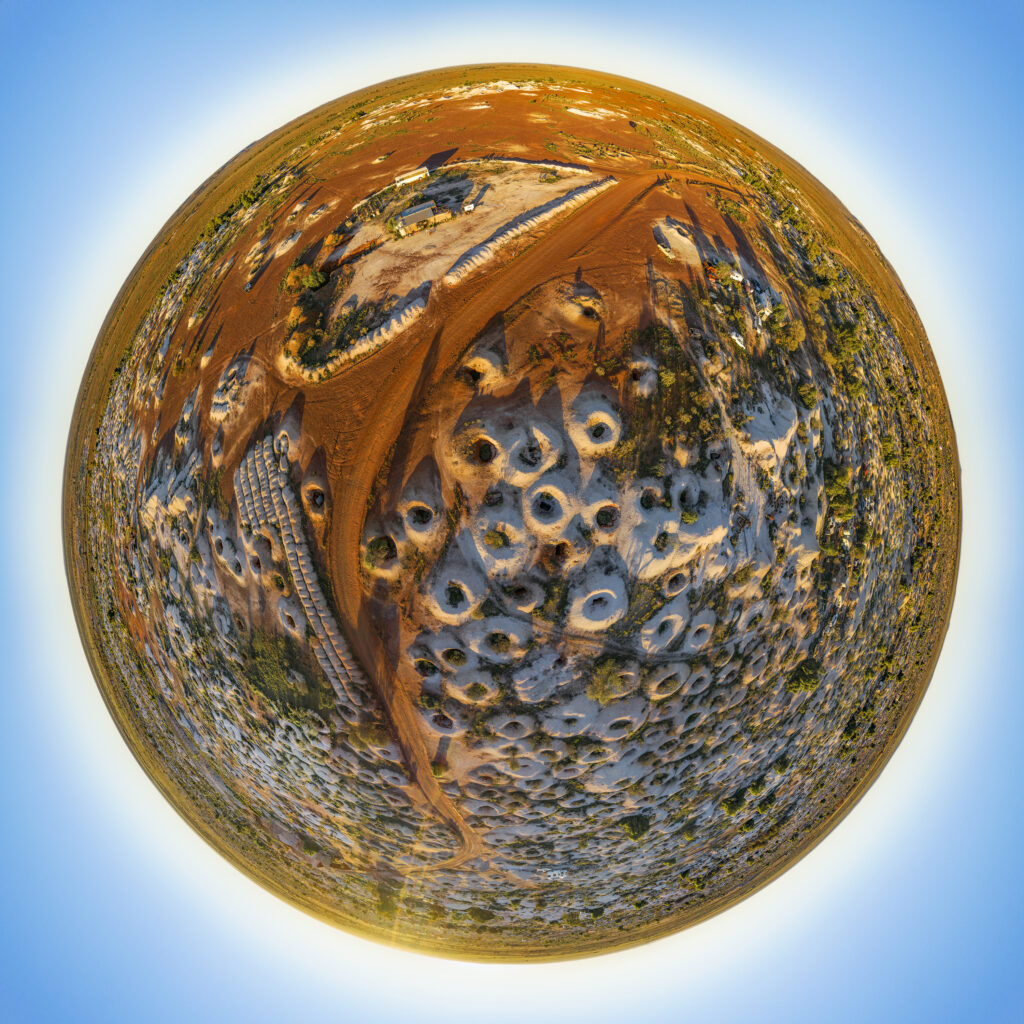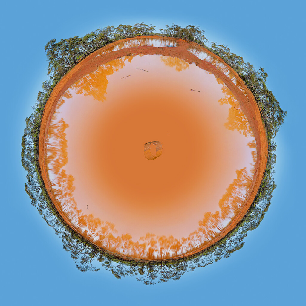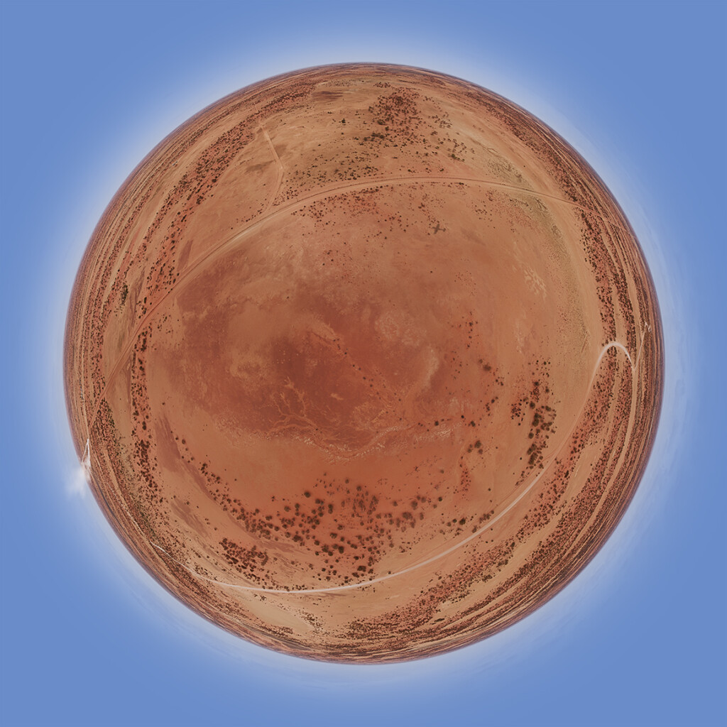 The ‘Unforbidden Ruralscapes’ series encapsulates man-made structures and landmarks, nestling them within the expansive ‘outback’ landscapes through aerial imagery captured by drones. These images are ingeniously woven into spherical compositions, pushing the boundaries of lens-based aerial photography both formally and aesthetically. This approach introduces an abstract, fresh perspective on contemporary landscapes and our role within them.
