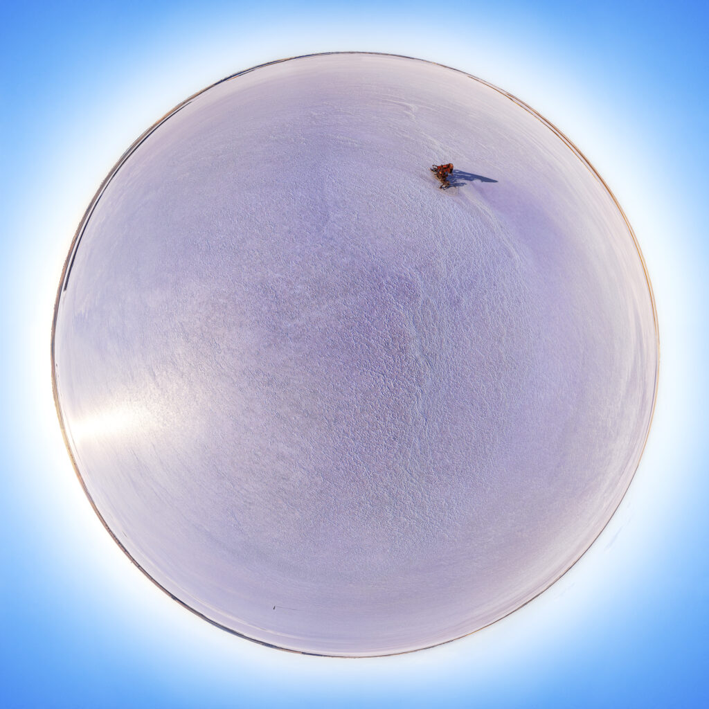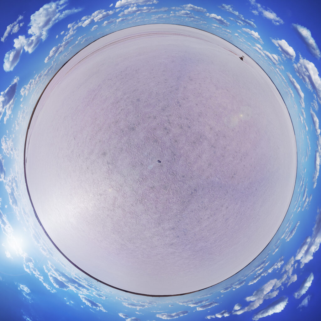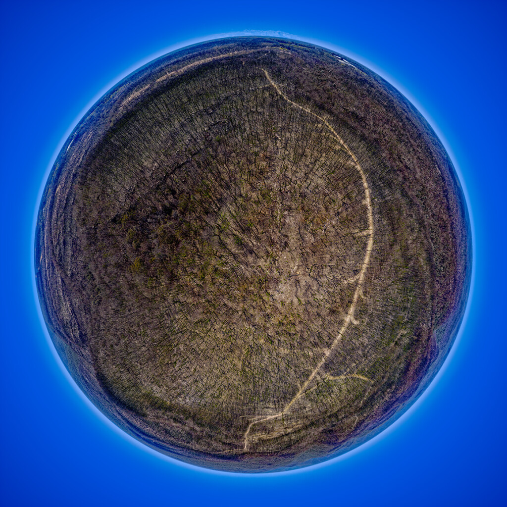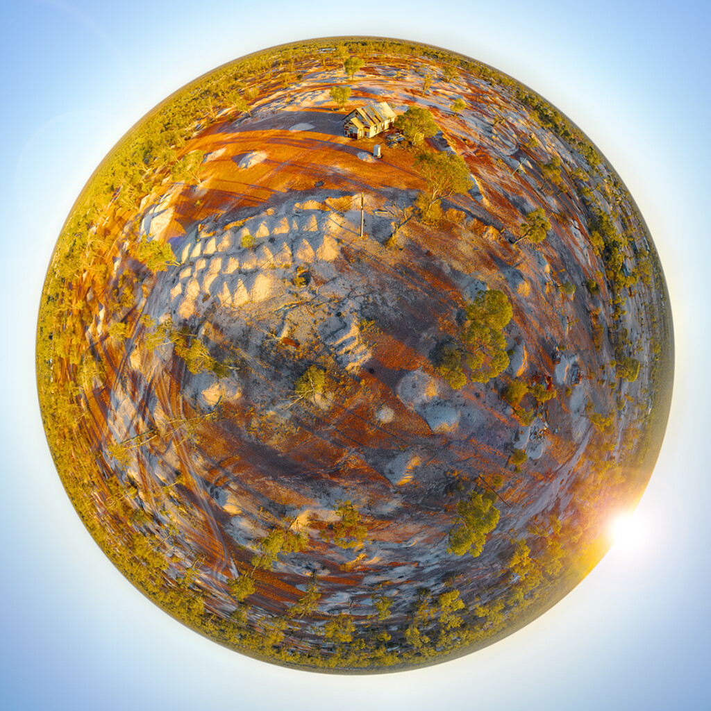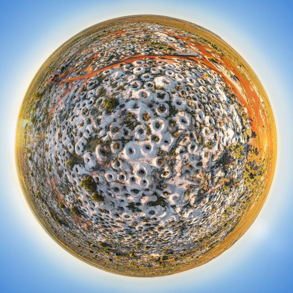 The ‘Unforbidden Ruralscapes’ series encapsulates man-made structures and landmarks, nestling them within the expansive ‘outback’ landscapes through aerial imagery captured by drones. These images are ingeniously woven into spherical compositions, pushing the boundaries of lens-based aerial photography both formally and aesthetically. This approach introduces an abstract, fresh perspective on contemporary landscapes and our role within them.