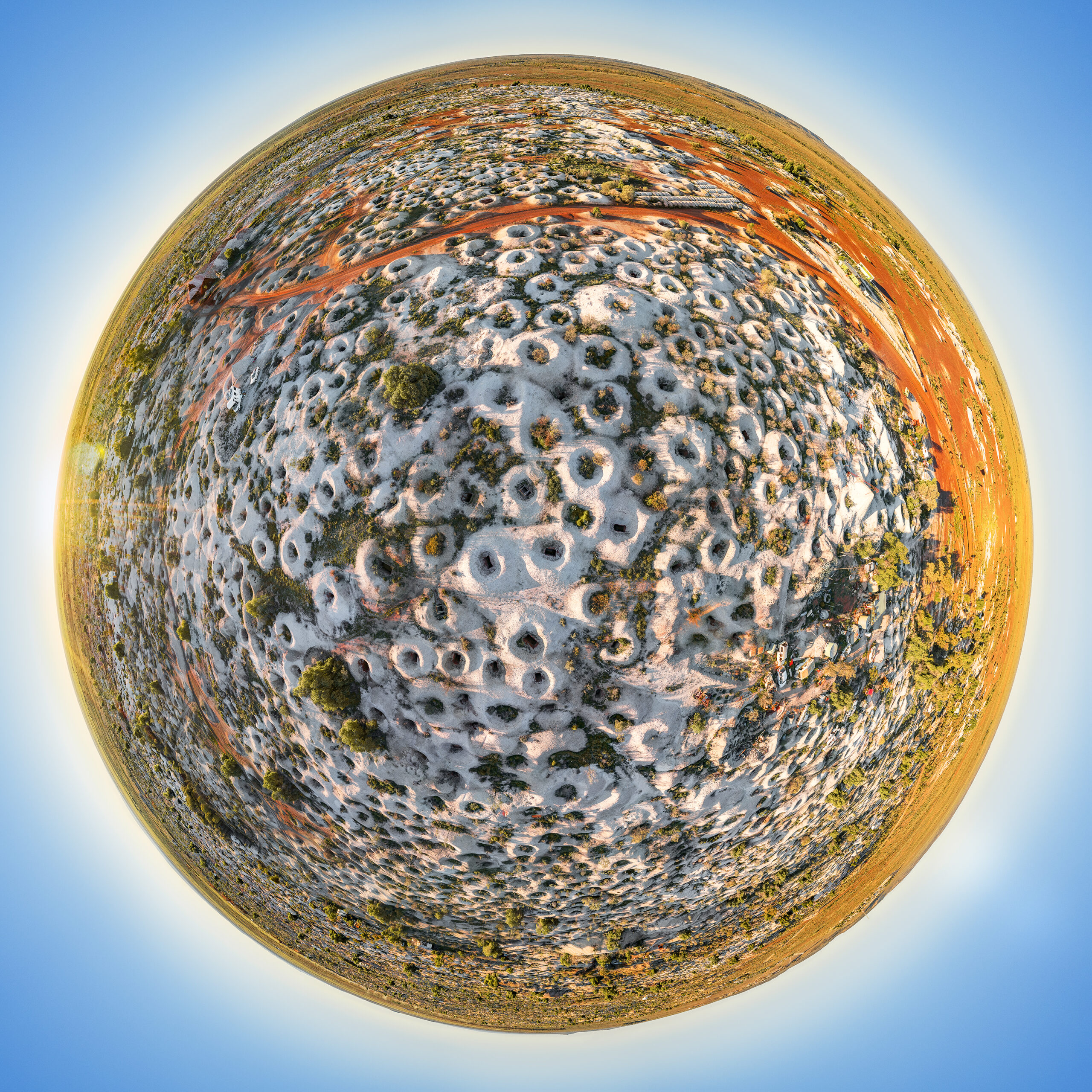 The ‘Unforbidden Ruralscapes’ series encapsulates man-made structures and landmarks, nestling them within the expansive ‘outback’ landscapes through aerial imagery captured by drones. These images are ingeniously woven into spherical compositions, pushing the boundaries of lens-based aerial photography both formally and aesthetically. This approach introduces an abstract, fresh perspective on contemporary landscapes and our role within them.